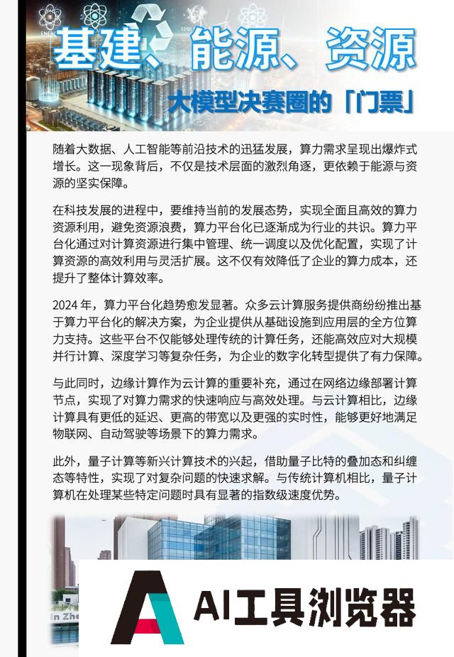 09基建、能源、资源将成为大模型决赛圈门票随着大数据、人工智能等前沿技术的迅猛发展,算力需求呈现出爆炸式增长。这一现象背后,不仅是技术层面的激烈角逐,更依赖于能源与资源的坚实保障。